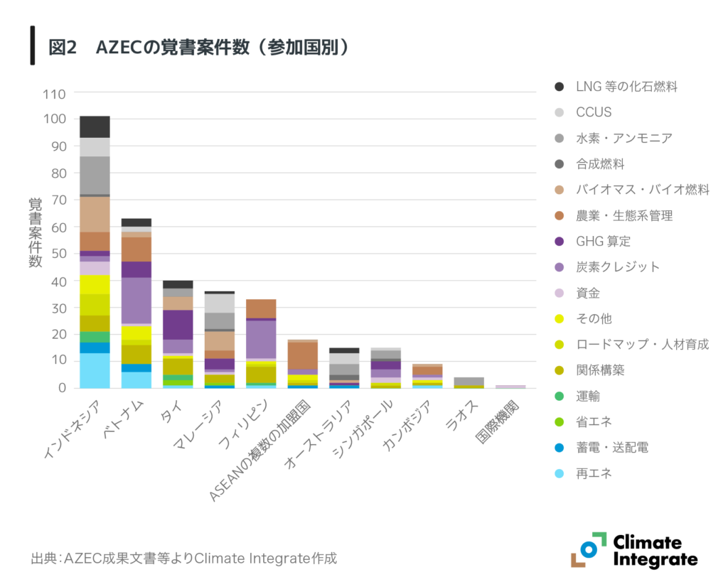 AZECの覚書案件数は、2024年の217件から2025年には335件へと増え、参加国と追加的な協力合意が締結されています。国別ではインドネシアに集中しており、引き続き最も積極的な参加国であることを示しています。次に、ベトナム、タイ、マレーシアとフィリピンが高い関与を維持している一方で、他のASEAN加盟国および国際機関の参加は限定的です。