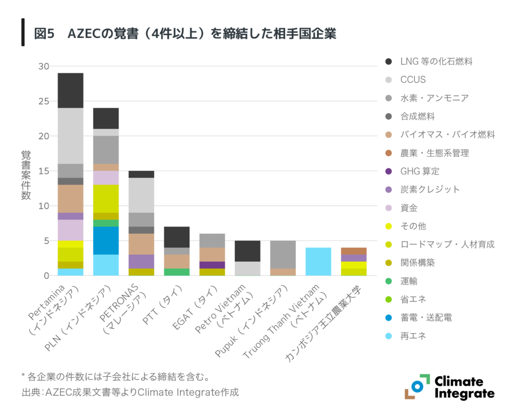 相手国企業は、インドネシアの PertaminaとPLN、それに続くマレーシアのPETRONASやタイの主要企業といった少数の大手エネルギー企業に引き続き集中しています(図5)。協力分野はこれまでと同様、化石燃料、CCUS、水素・アンモニアが多く、ほかの分野の企業や、関与が少ない国の覚書は限られています。