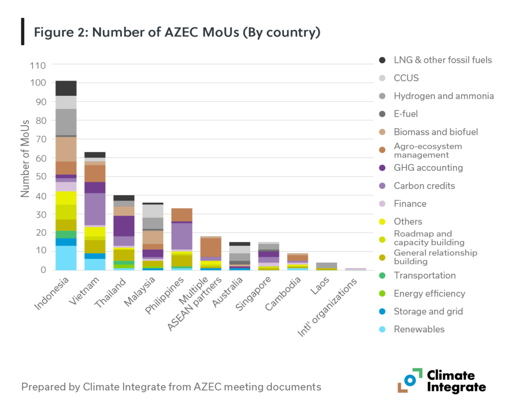 It shows a continued concentration of MoUs with Indonesia further reinforcing its position as the most active partner. Vietnam, Thailand, Malaysia and Philippines remain the next most engaged countries, while participation from other ASEAN member states and international organizations remains limited. The overall geographic pattern of AZEC cooperation has remained largely unchanged and still uneven across partner countries (Figure 2).