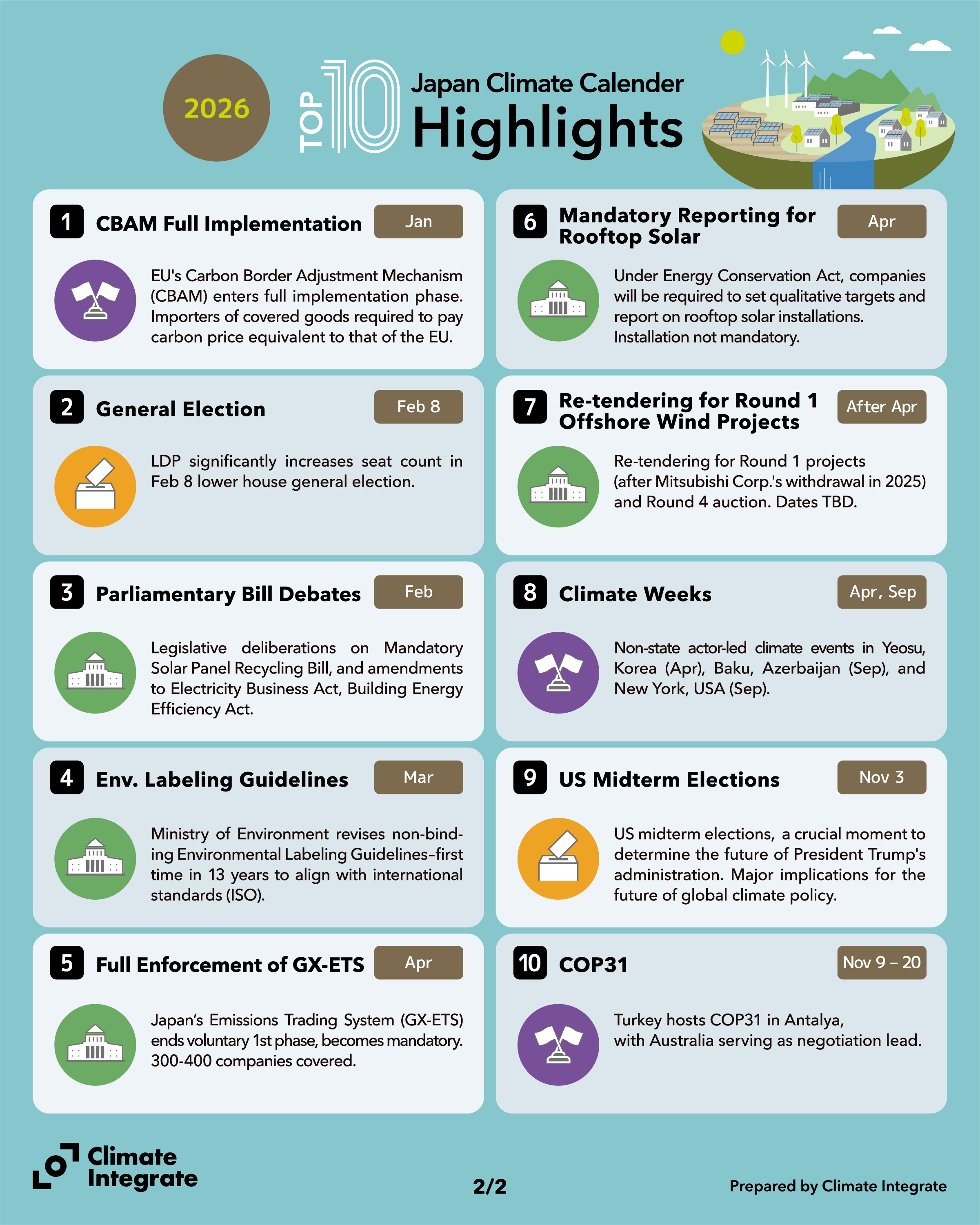 Japan’s emissions trading system (GX-ETS) launches in April. Covered companies will move to a mandatory system from a voluntary efforts system in which CO₂ emissions kept within government-allocated allowances. Meanwhile, even as moves emerge to restrict environmentally destructive large-scale solar developments, policy support for renewable energy remains weak. In 2026, it is hoped that renewable energy projects—including offshore wind—will regain momentum and move forward more rapidly.