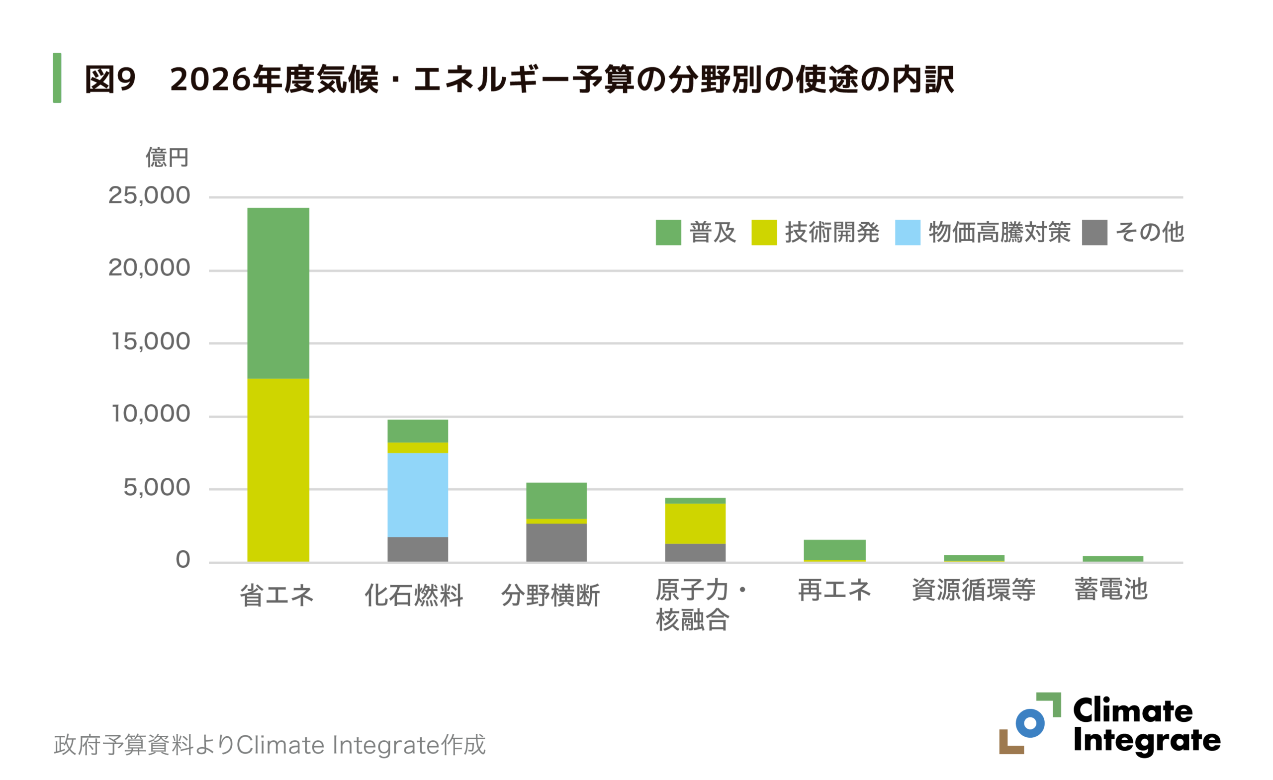 その結果、気候・エネルギー予算の分野別割合は、省エネ分野(AI・半導体など)が52%、化石燃料分野(価格緩和など)が21%、原子力・核融合分野(危機管理、革新炉など)が10%であり、再エネ分野はわずか3%であることがわかりました。